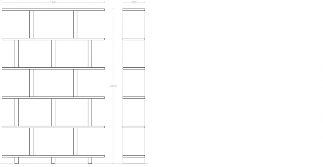 Une variation d’une typologie classique d’étagère de Charlotte Perriand et d’autres consistant en un simple assemblage de blocs verticaux épais qui maintiennent entre eux des tablettes horizontales plus fines. Les blocs sont disposés selon un quadrillage rigoureux produisant à la fois stabilité structurelle et rythme visuel. Tous les éléments constitutifs de l’étagère sont réalisés en bois massif sans aucun collage et fixés par assemblage mécaniques..